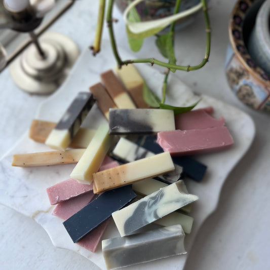 All of our soaps are made with Coconut Oil, Olive Oil, Shea Butter, Grass-fed Beef Tallow, Sweet Almond Oil, Castor Oil, natural colorants like clays & herbs, and scented only with Essential Oils.